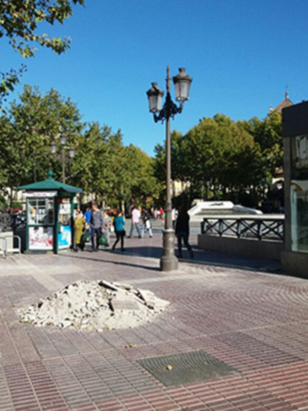 Las personas que pasan por Puerta de Jerez no salen de su asombro de ver en pleno acerado escombros abandonados, junto a la boca de Metro. Lamentable imagen para una ciudad que vive y quiere seguir viviendo del turismo. hora 16:15 pm
