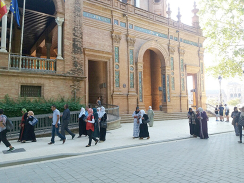 Dentro del incremento general que está teniendo el turismo en Sevilla, cabe destacar el incremento del turismo procedente de países árabes. Cada día son más los grupos organizados y familias que nos visitan en esta época del año. Es un turismo que gusta de ir a las rebajas. Es un turismo que procede de climas tanto o más cálidos que el nuestro y por esa razón no ocurre como con el turismo de centro y norte de Europa que estos meses prefieren visitar las playas. Tanto los turistas árabes, como coreano, chinos, hindúes y japoneses tienen un problema de comunicación ya que no encuentran señalización o explicaciones alusivas de monumentos y parques y jardines en su idioma.