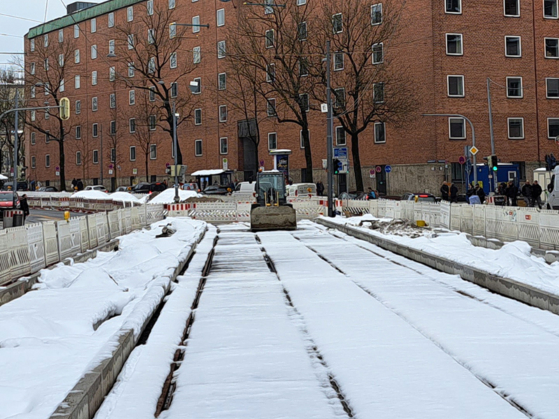 La obra del tranvía paralizada por la nieve.