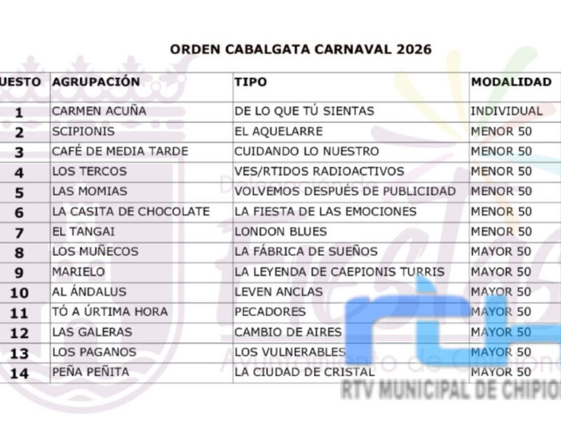 El orden que ha quedado establecido tras el sorteo es el siguiente: el primer lugar el para el individual de Mari Carmen Díaz Acuña ‘De lo que tú sientas’. A continuación le siguen los grupos de hasta 50 componentes por el siguiente orden: Scipionis con ‘El Aquelarre’, el Café de Media Tarde con ‘Cuidando lo nuestro’, Los Tercos con ‘Ves/rtidos radioactivos’, Las Momias con ‘ Volvemos después de publicidad’, La Casita de Chocolate con ‘La fiesta de las emociones’ y El Tangai con ‘London Blues’. Le siguen los grupos con mas de 50 componentes en este orden: Los Muñecos con ‘La fábrica de sueños’, Marielo con ‘La leyenda de Caepionis Turris’, Al Ándalus con ‘Leven anclas’, Tó a Úrtima Hora con ‘Pecadores’, Las Galeras con ‘Cambio de aires’, Los Paganos con ‘Los vulnerables’ y, por último, la Peña Peñita con ‘La ciudad de cristal’.