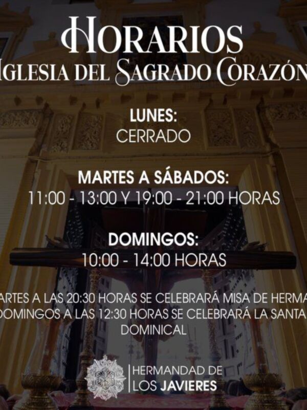 El Hermano Mayor y la Junta de Gobierno de la Hermandad y Cofradía de Nazarenos del Santísimo Cristo de las Almas, María Santísima de Gracia y Amparo, María Inmaculada y San Francisco Javier comunican a todos los hermanos y fieles que, a partir del próximo día 10 de febrero, la Iglesia del Sagrado Corazón, nueva sede canónica de la Hermandad, sita en la calle Jesús del Gran Poder, nº 40, abrirá al público conforme al siguiente horario:
