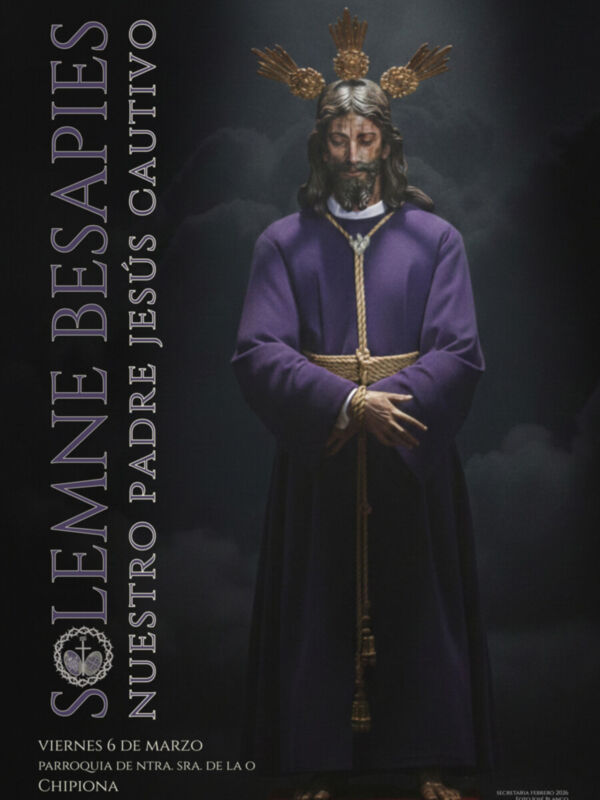 El próximo viernes, 6 de marzo, tendrá lugar el Solemne Besapiés a Nuestro Padre Jesús Cautivo. Se trata de una de las citas más esperadas por los hermanos y devotos, donde la sagrada imagen estará expuesta para la veneración pública en un altar extraordinario.