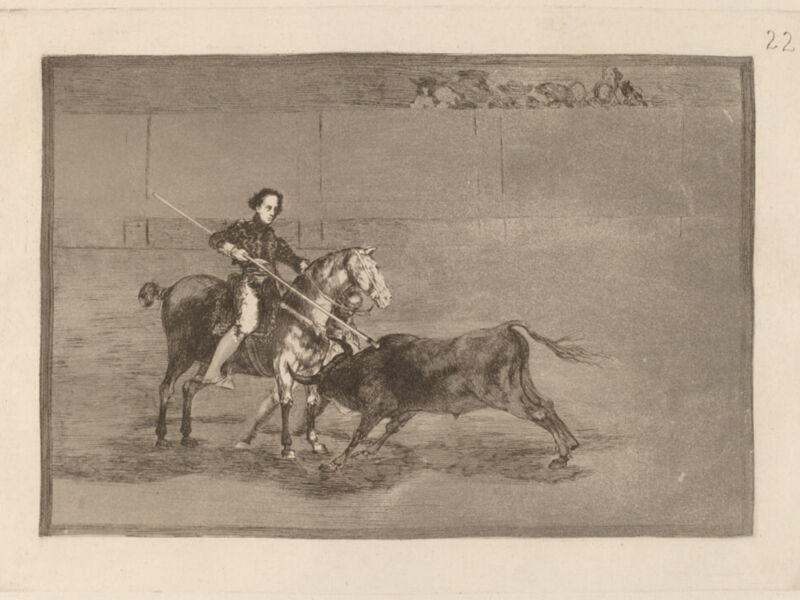 Aficionado a los toros, enamorado del animal que tanto representa y se identifica con la cultura española, con esa parte ritual de la fiesta en donde la vida y la muerte se enfrentan al límite, esto es, con la Fiesta con mayúsculas como pervivencia (y supervivencia) ancestral, GOYA ya los había captado desde su primera juventud, cuando un maestro de la categoría tan inmensa como el que llegó a ser, estaba desplegando los caminos que recorrería su amplísima y variada obra. Por esto, porque el mismo autor se identifica como el MINOTAURO, no podía dejar de representarlos, de dedicarles algo más que unos cartones o unos lienzos, sino llevarlos más allá del lápiz y del pincel, impregnarlos con la fortaleza de su muñeca en la serie de grabados a buril sobre planchas de cobre, donde para quien esto escribe radica una de sus mayores facetas para la posteridad de ambas Artes: la Tauromaquia y la Pintura.