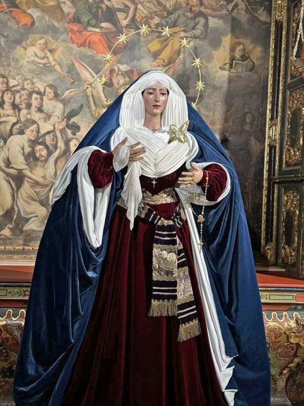 Siguiendo esta arraigada tradición, la Santísima Virgen luce tocado de seda dispuesto a tablas, evocando la sobriedad y el simbolismo característicos de estas fechas. En su pecho porta el puñal que alude proféticamente al dolor anunciado por el anciano Simeón, mientras que la corona de doce estrellas que la ciñe remite a la visión apocalíptica de la Mujer vestida de sol, signo elocuente de su realeza y de su papel en la Historia de la Salvación.